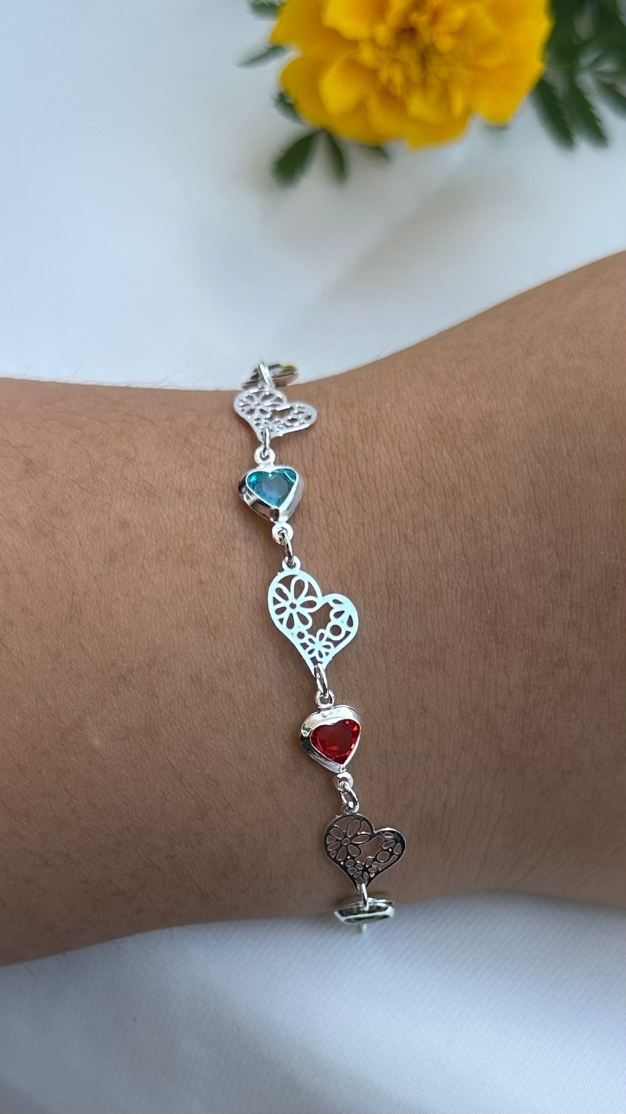 Seja o primeiro a avaliar “Pulseira banhada a prata com corações com arabescos e pedras coloridas alternadas”